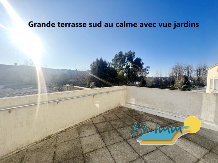 Ref : 2453fRare, en hyper centre, beau T2 de 46 m² avec très grande terrasse sud et garage, en parfait état, entrée, séjour et cuisine équipée, chambre et salle de bains. Idéal senior, investisseur....